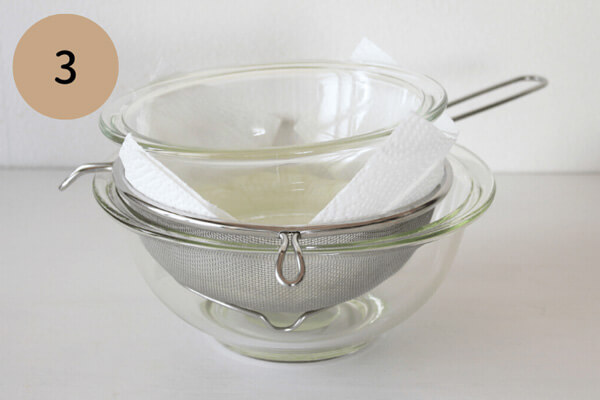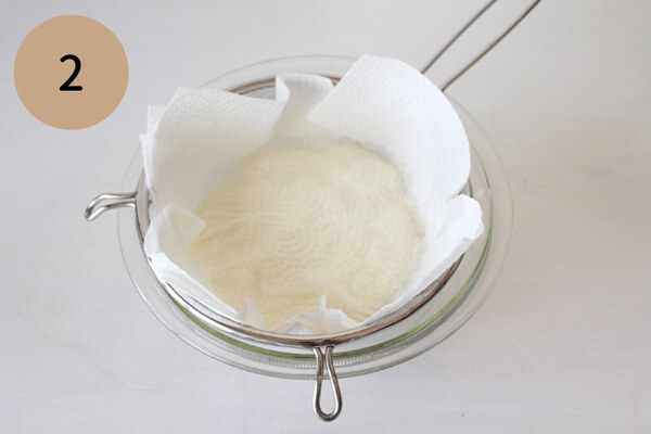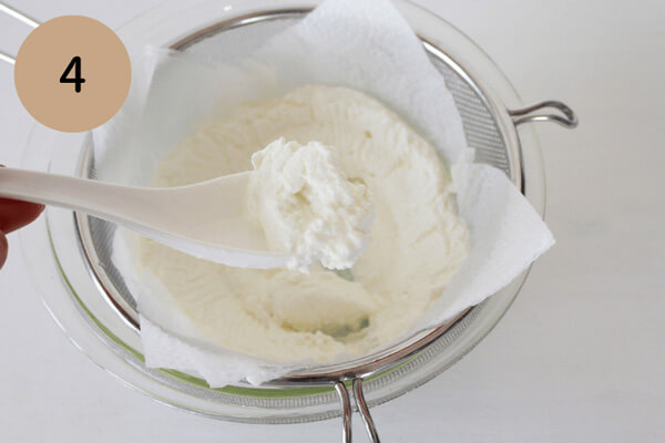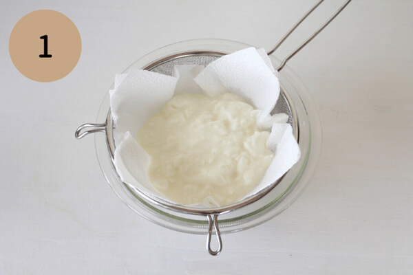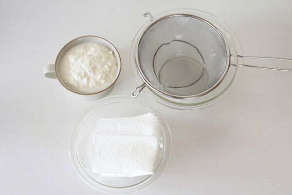 1. 大きいボウルにザルをのせ、キッチンペーパーを2枚重ねてザルの上に敷く。キッチンペーパーの上にヨーグルトをのせる。