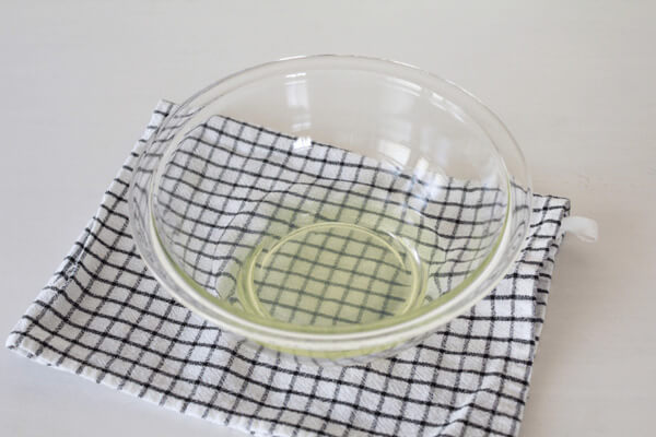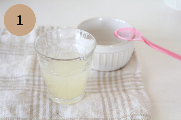 1. 水にゼラチンを入れ、軽くかき混ぜてふやかす。600Wの電子レンジで20秒加熱し、混ぜてゼラチンを溶かす。ゼラチンの粒が残っている場合は追加で5~10秒加熱して完全に溶かす。