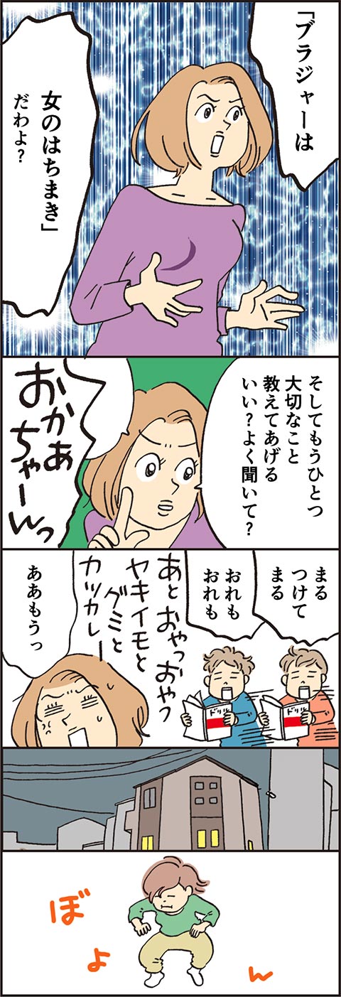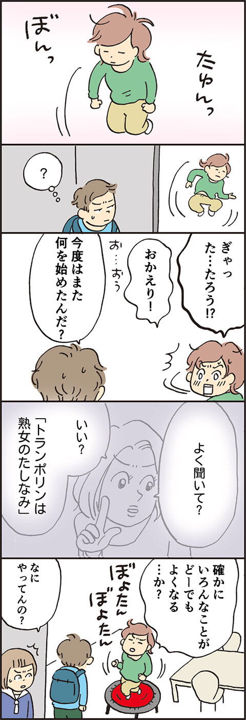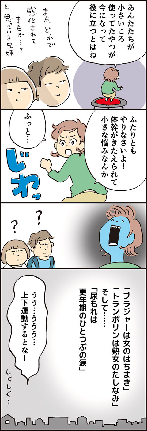 トランポリンの上下運動で、尿もれする圭子。それは、波乱万丈の更年期をくぐり抜ける中で流れた尊いひとつぶの涙ーー。その涙が報われる日は来るのか⁉︎ ブラジャー改め女のはちまきをギュッとしめる圭子に訪れる次なる試練やいかに⁉︎