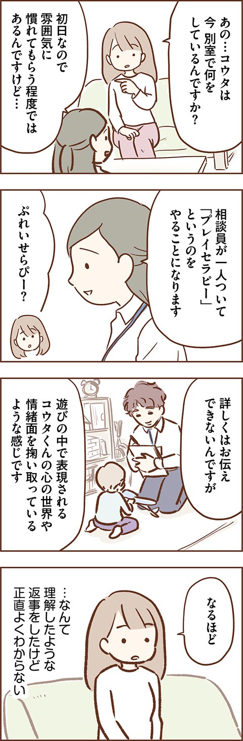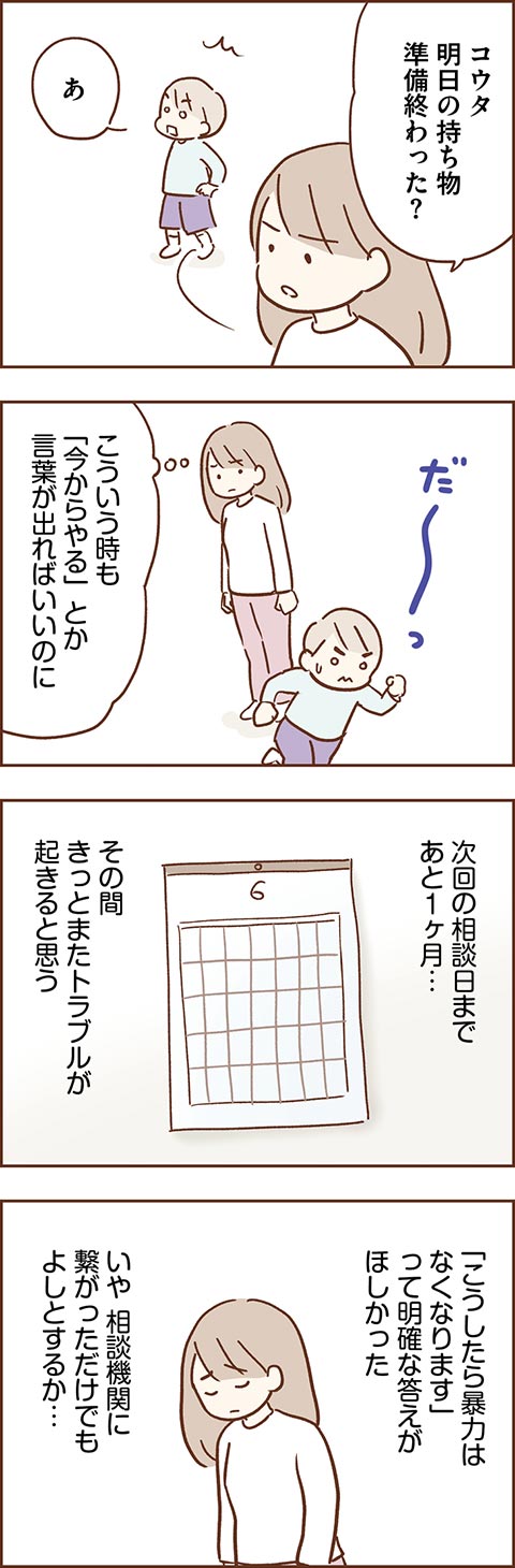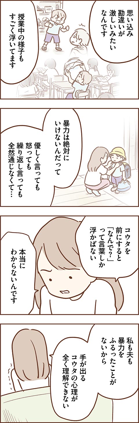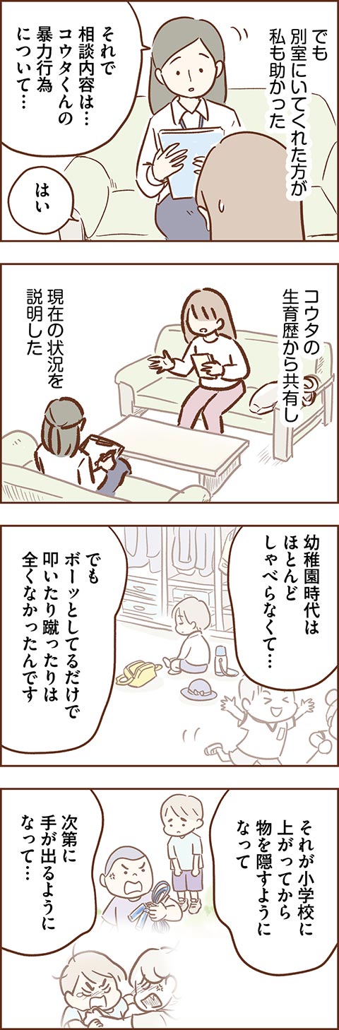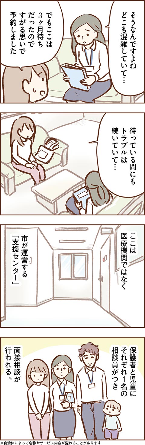 支援センターのサポートを受け始めたものの、夫からはサポートどころかなかなか理解すら得られないカンナ。支援センターという心強いサポーターを得て、コウタのトラブルが改善していくことを願わずにはいられません。