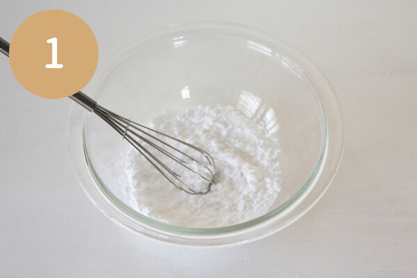 1. 耐熱ボウルに片栗粉・砂糖を入れ、ダマがなくなるまでよく混ぜる。