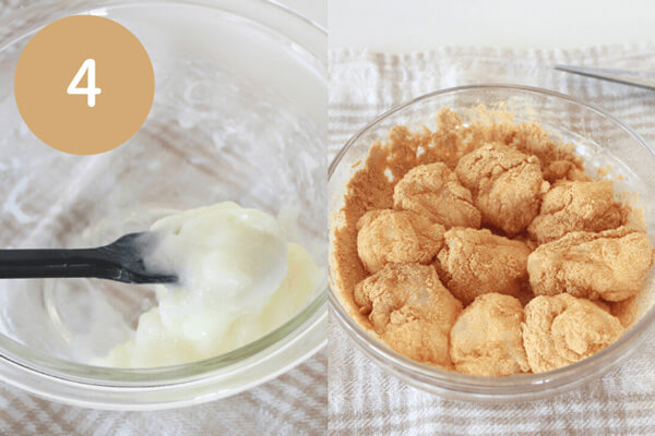 4. 電子レンジから取り出し、よく混ぜる。一塊になったらきな粉を入れた容器におもちを移す。