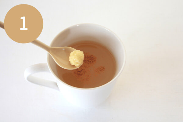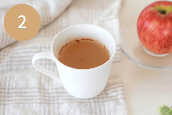 1. 耐熱マグカップにリンゴジュースを注ぎ、チューブ生姜とシナモンを入れてよく混ぜる。