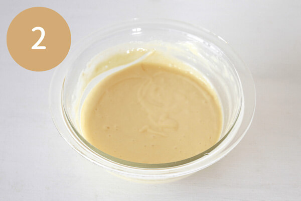 2. 1のボウルにホットケーキミックスを入れ、粉気がなくなるまで混ぜる。