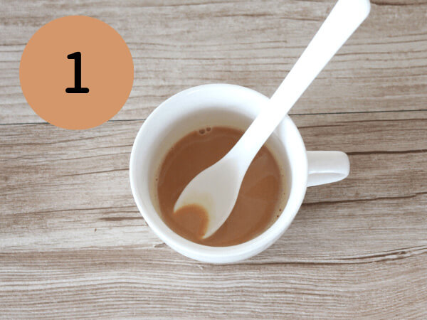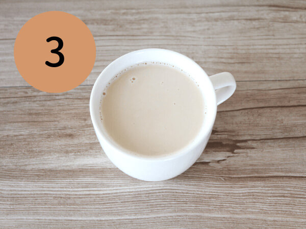2. 牛乳を600Wの電子レンジで1分30秒温め、1のマグカップに入れる。コーヒーの粒がなくなるまでよく混ぜる。