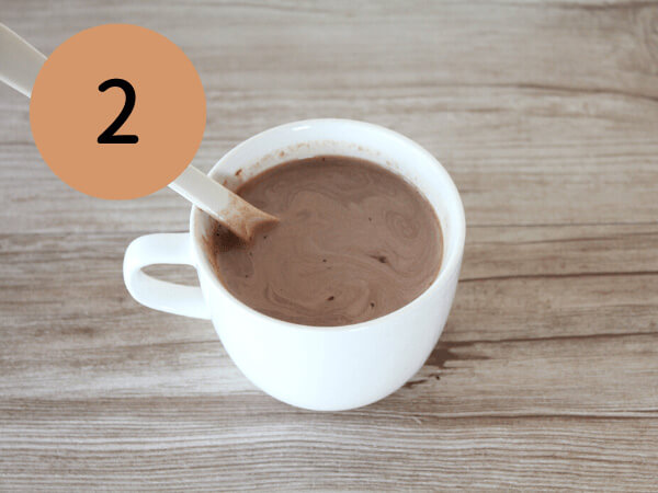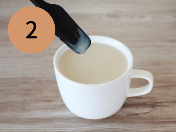1. マグカップにミルクキャラメルと牛乳10mlを加え、600Wの電子レンジで40秒加熱する。よくかき混ぜてキャラメルを溶かす。