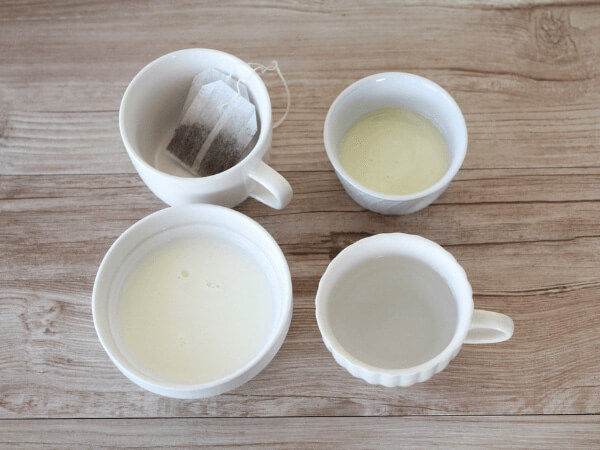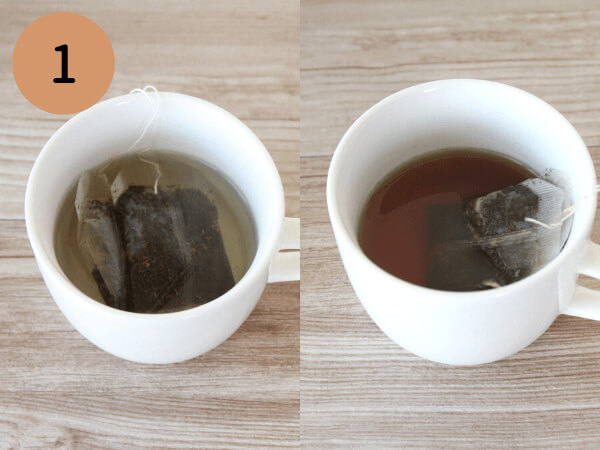 1. マグカップにほうじ茶ティーバッグ2袋を入れ、熱湯を注ぐ。3分蒸らし、ティーバッグを取り出す。