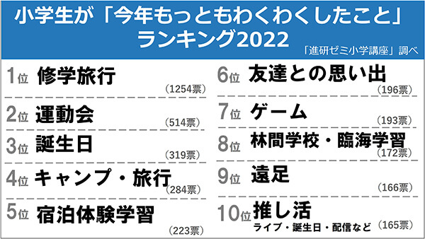 「進研ゼミ小学講座」が実施した「2022年の出来事や将来に関する小学生の意識調査」から「今年もっともわくわくしたこと」の結果をご紹介します。