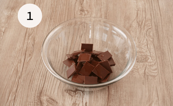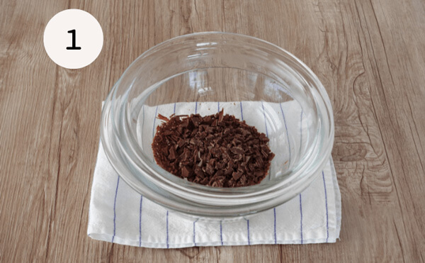 電子レンジを使用する場合は、600Wで30秒加熱し、チョコレートが溶けるまで10秒ずつ追加加熱する。その都度よく混ぜる。