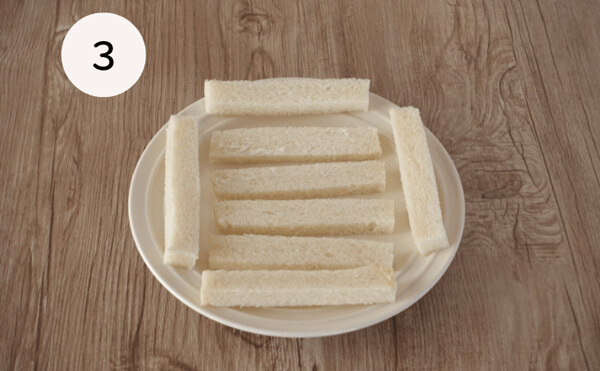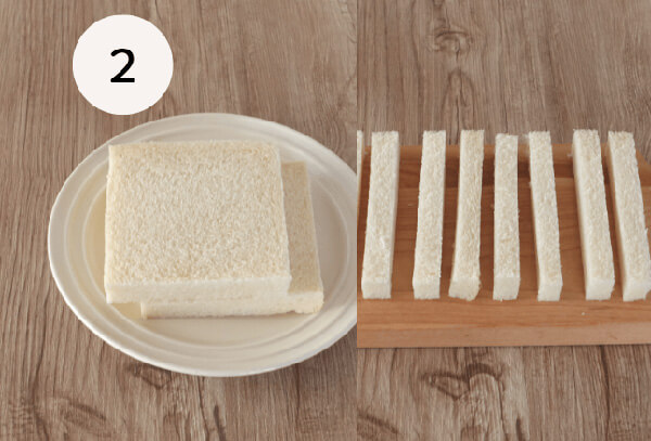 2.食パンは耳を切り落とし、1枚の食パンを縦8本に切り分ける。(計16本のスティックができます)