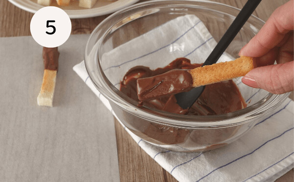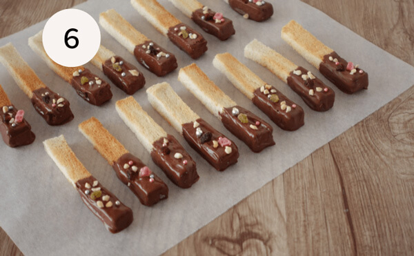 5.溶かしたチョコレートをパンに塗り、クッキングシートに並べる。