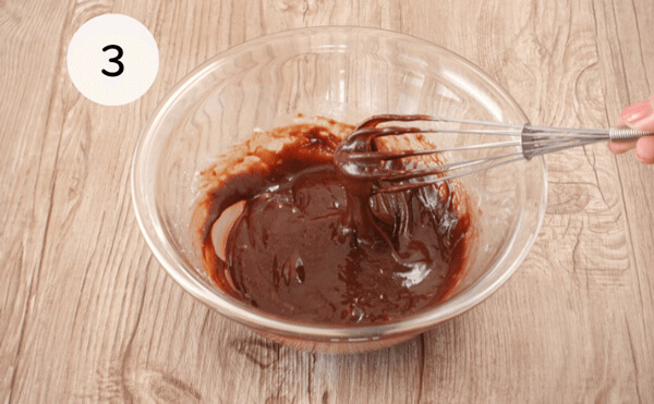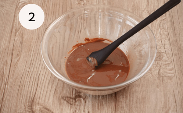 2.1で加熱したチョコレートをゴムベラで滑らかになるまでよく混ぜる。チョコレートの固まりが残っている場合は、追加で10秒ずつ加熱して溶かす。