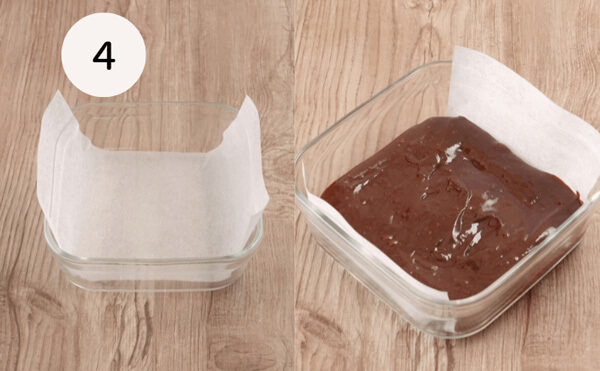 4.耐熱容器にクッキングシートを敷き、生地を流し入れる。600Wの電子レンジで2分30秒加熱する。ドロドロした生地が残っている場合は、追加で10秒ずつ加熱して火を通す。