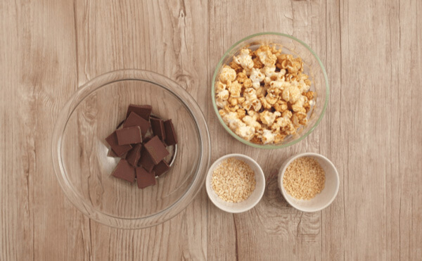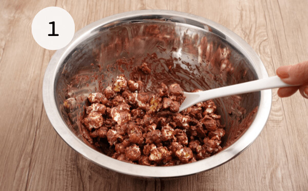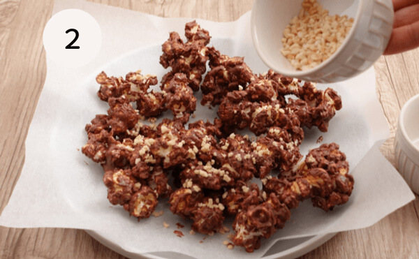 電子レンジを使用する場合は、600Wで30秒加熱し、チョコレートが溶けるまで10秒ずつ追加加熱する。その都度よく混ぜる。ポップコーンを加え、チョコレートを絡める。