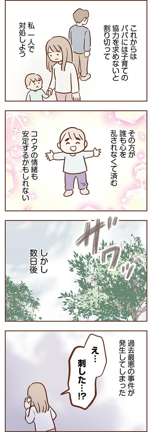 かみ合わない夫とのすれ違いが決定的になっていく中で発生してしまった過去最悪の事件。コウタが刺してしまったのは、一体誰? コウタをそこまで追い詰めてしまった理由も気になります。