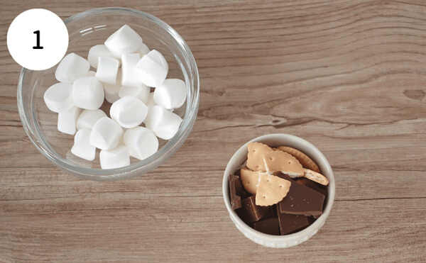 1. マシュマロはキッチンばさみで半分に切る。飾り用クッキーとチョコレートは手で食べやすい大きさに割る。