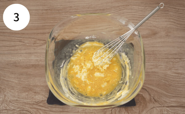3. 卵をときほぐし、バターに加えてさっと混ぜる。バターと卵が分離しても問題ありません。