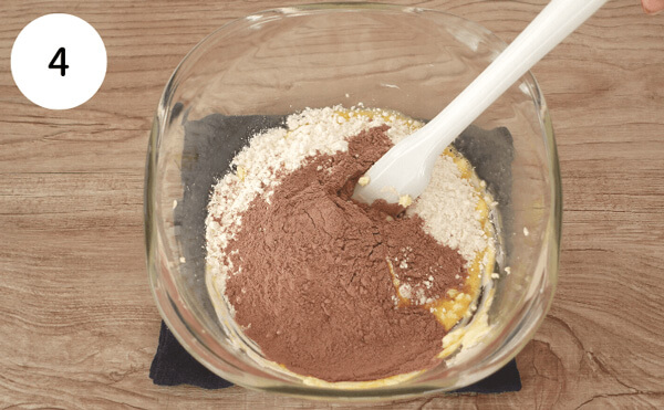 4. 3のボウルにホットケーキミックスとミルクココアを加える。