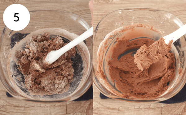 5. ゴムベラでボウルの底に生地をすりつけるように混ぜる。バターの塊がなくなるまで繰り返す。