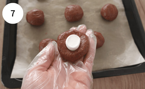7. 1で半分に切ったマシュマロを1つずつクッキー生地で包む。肉まんやお団子の具材を包み込むようにクッキー生地を軽く広げてマシュマロを埋め込み、つまんで閉じる。170℃のオーブンで15分焼く。