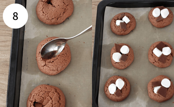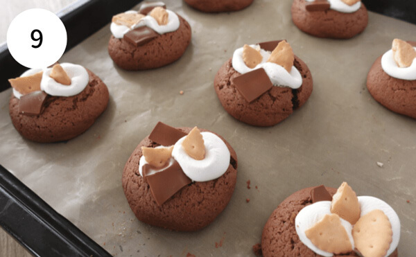 8. 一度天板を取り出し、スプーンやフォークでクッキー生地の真ん中を押し、くぼみを作る。残りのマシュマロをくぼみにのせ、お好みでチョコレートやクッキーも追加してください。170℃のオーブンでさらに3分追加で焼く。