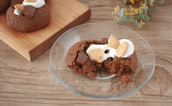 柔らかい食感のクッキー生地でマシュマロを包み、チョコレートなどをトッピングします。