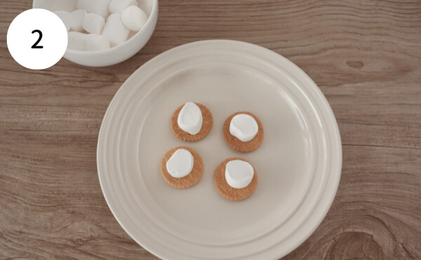 2. 耐熱皿にクッキーを並べ、上にマシュマロをのせる。600Wの電子レンジで10秒加熱する。1度に加熱できるのは4枚までです。