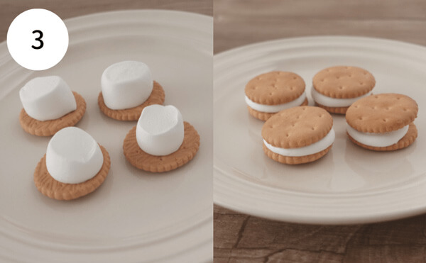 3. マシュマロが一回り大きく膨らんだら電子レンジから取り出し、残りのクッキーでマシュマロを挟む。