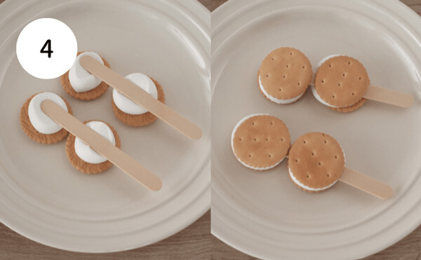 4. 2で加熱したマシュマロクッキーを2つ並べ、アイスの棒を挟むとロリポップ風に。