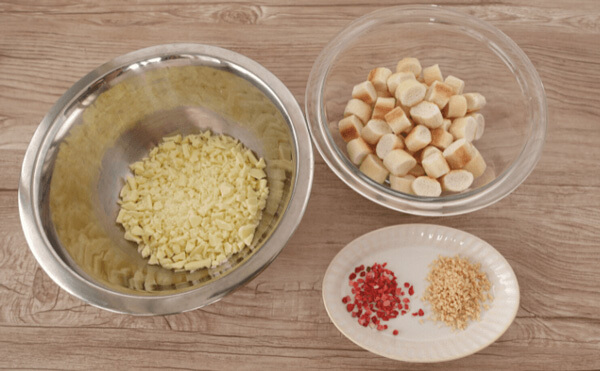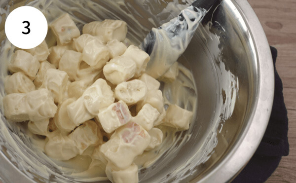 3. 2で溶かしたチョコレートにおつゆ麩を入れ、チョコレートが全体に絡むようによく混ぜる。
