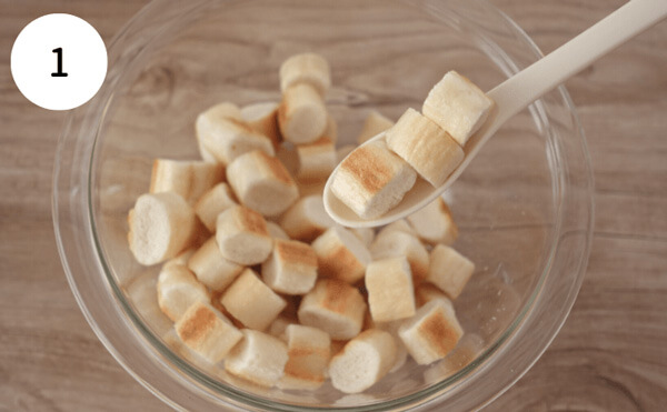 1. おつゆ麩を耐熱ボウルに入れ、600Wの電子レンジで50秒~1分加熱し、水分を飛ばす。