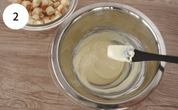 2. ホワイトチョコレートを刻み、50℃前後のお湯で湯煎して溶かす。