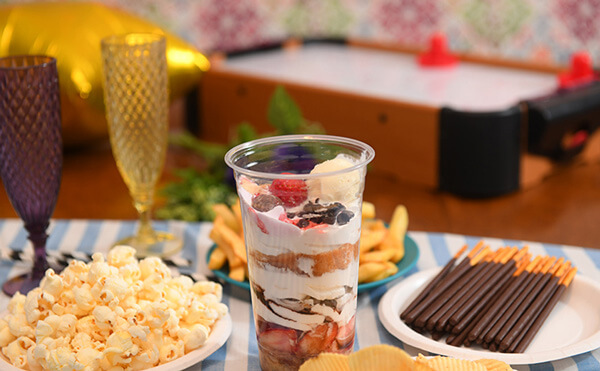ストロベリーパフェとフライドポテト(筆者が実際に注文して撮影)。ちょっとしたパーティーにも。複数のお店のスイーツ食べ比べをおうちで楽しむこともできます。