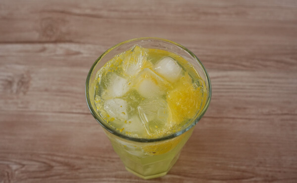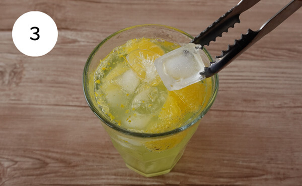 2. 1のグラスにお好みのかんきつ類と皮のすりおろしを入れ、静かに炭酸水をそそぐ。