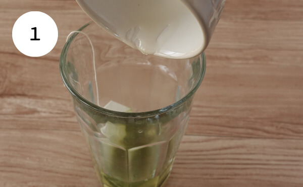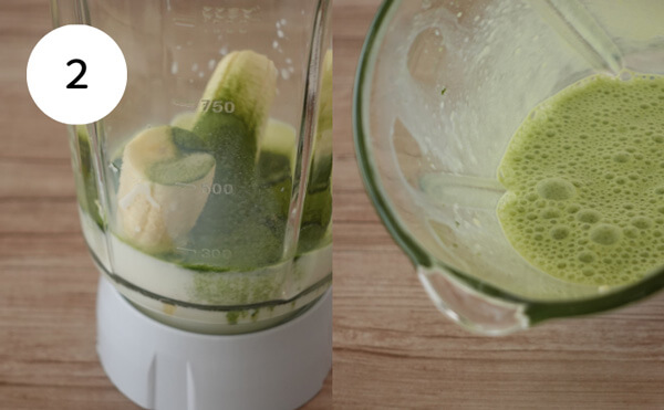 2. ミキサーにすべての材料を入れ、なめらかになるまでかくはんする。