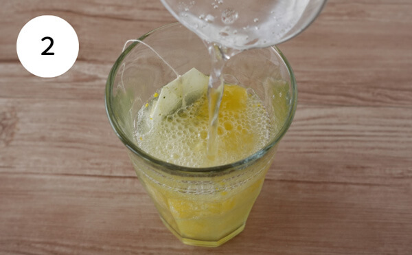 2. 1のグラスに砂糖・レモン汁を加え、砂糖が溶けるまでよく混ぜる。