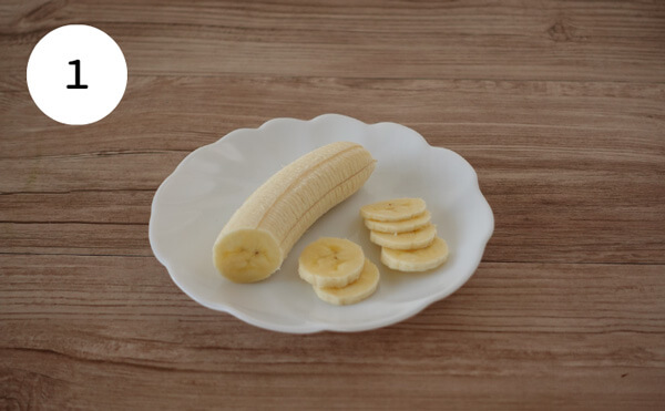 1. 飾り用にバナナ1/5本程度を薄くスライスしてとっておく(省いてもOK)。