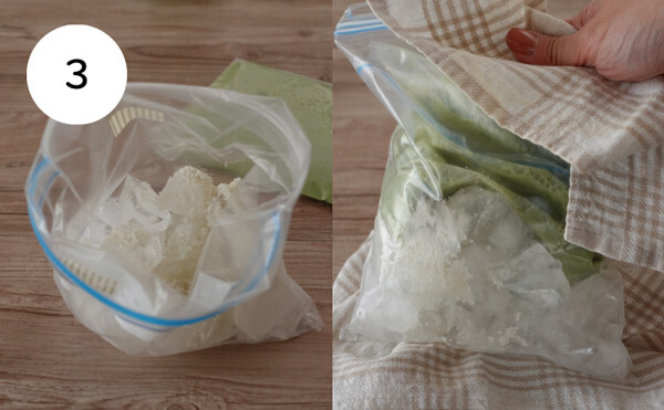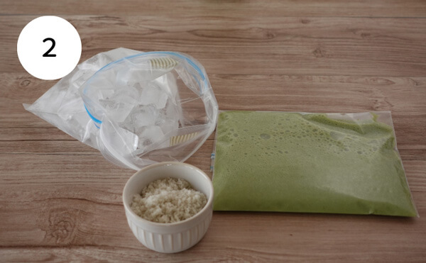 3. 氷を入れたフリーザーバッグに塩を入れる。スムージーを入れたフリーザーバッグをその中に入れ、5~10分間全体に氷が当たるように強く振る。その際、袋が冷たくなるのでふきんで包むか軍手を使用するとよい。スムージーがシャーベット状になったら、ふきんで包んで5分ほど待つ。