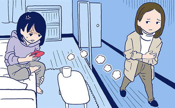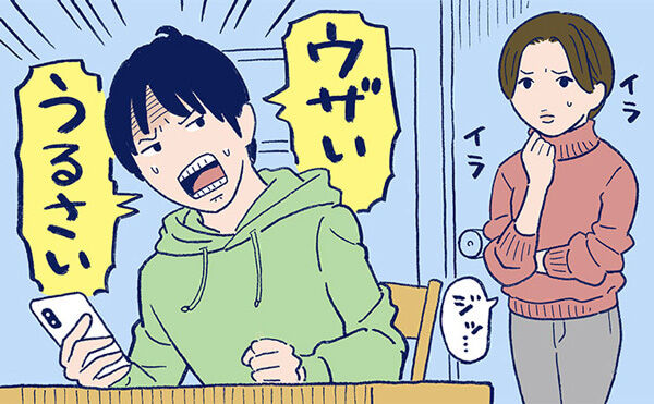 イヤな言葉を投げてきた時に、「とにかく距離を置かなきゃ」と部屋を出て行こうとしたら「逃げるな!」とどなられました。「お母さんがいけなかったのかな? ごめんね」と謝ってみたら、「何それ? 演技がお上手ですね」と言われたことも。どんなふうに対応しても、いったん火がついたら子どものイライラは収まらないようです……。