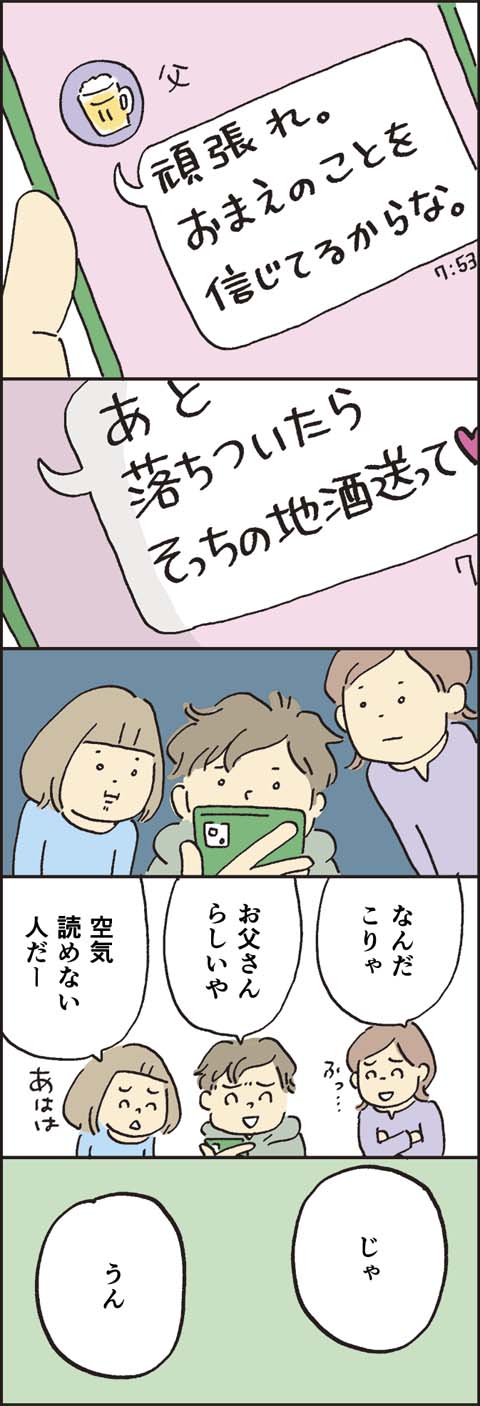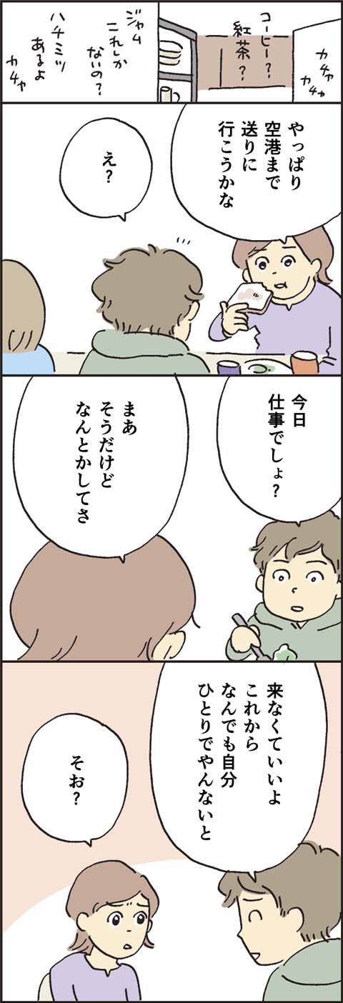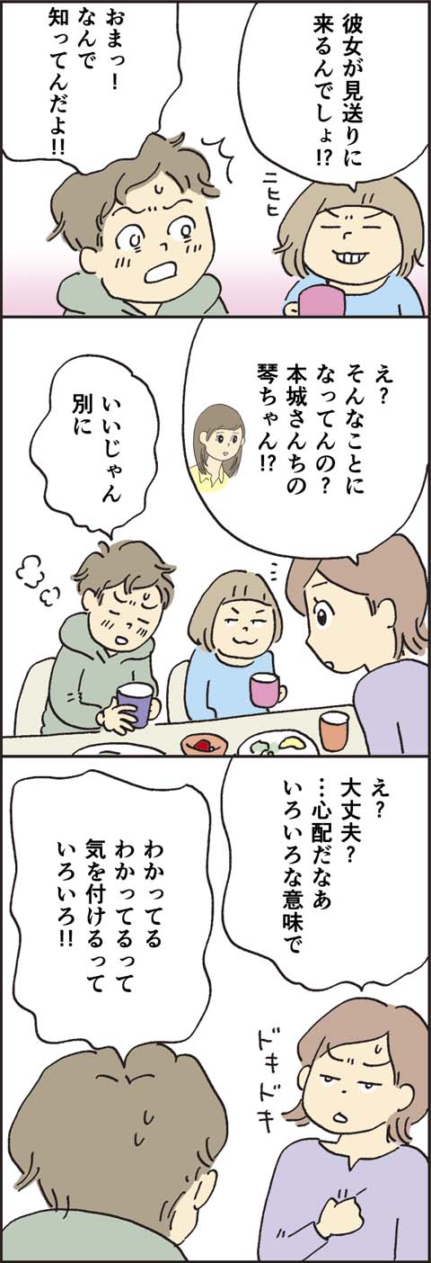 飛行機の距離の大学に進学することになった長男・太郎。ついに、家を出る日を迎えます。いつも通りなようで、いつも通りでない一ノ瀬家の風景やいかに……。