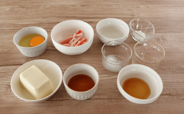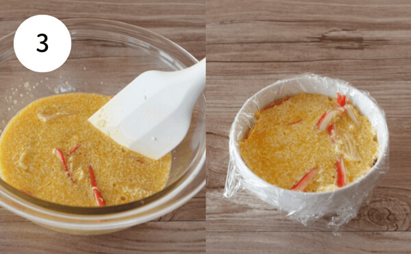 3. 2にほぐしたカニカマを加え、軽く混ぜる。ラップを敷いた耐熱容器に移し、600Wの電子レンジで3分加熱する。(容器の大きさは直径10.5cm 深さ5cm程度)