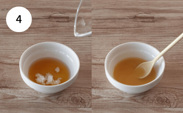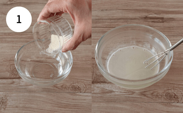 1. 耐熱容器に水とゼラチンを加え、20秒ほど待ち、ゼラチンをふやかす。600Wの電子レンジで20~30秒加熱し、ゼラチンを溶かす。