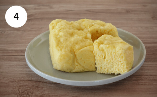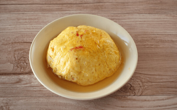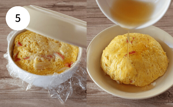 5. 3で加熱したたまごを容器から取り出す。上からお皿をかぶせ、ひっくり返す。4のタレをかけたら完成です。