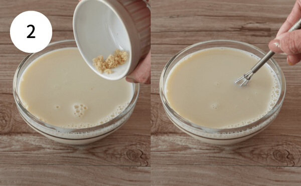 2. 1のゼラチン液に、豆乳と砂糖を加え、砂糖が溶けるまでよく混ぜる。ラップをして冷蔵庫で3~4時間固まるまで冷やす。