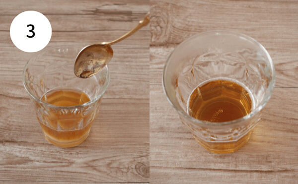 3. 2を冷やしている間に、シロップをつくる。耐熱容器にAの材料を入れ、600Wの電子レンジで30秒加熱する。シロップが熱くなるので、レンジ加熱後3分ほど待ってから取り出す。よく混ぜて砂糖を溶かしておく。