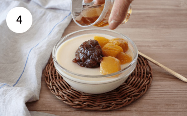 4. 2が固まったら、お好みであんこ、マンゴーをのせる。3のシロップをかけて完成です。
