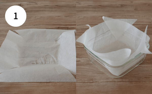 1. 耐熱容器にクッキングシートを敷く。角に斜めに切り込みを入れるときれいに敷くことができます。