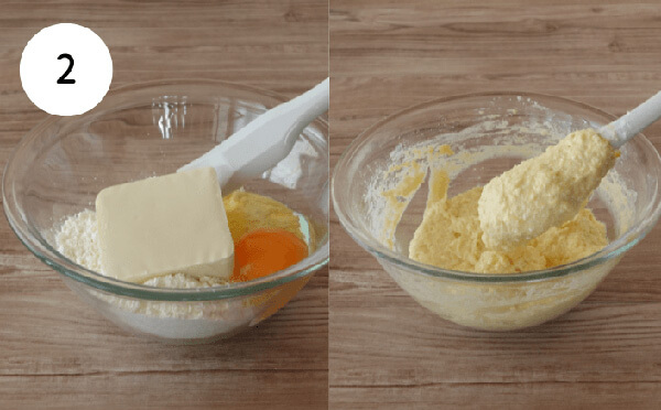 2. ホットケーキミックスに、豆腐、たまごを加え、粉っぽさがなくなるまでゴムベラで切るように混ぜる。