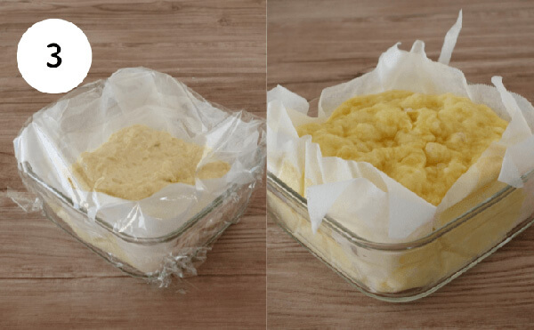 3. 1の容器に2の生地を移し、上からふんわりラップをかける。600Wの電子レンジで5分加熱する。