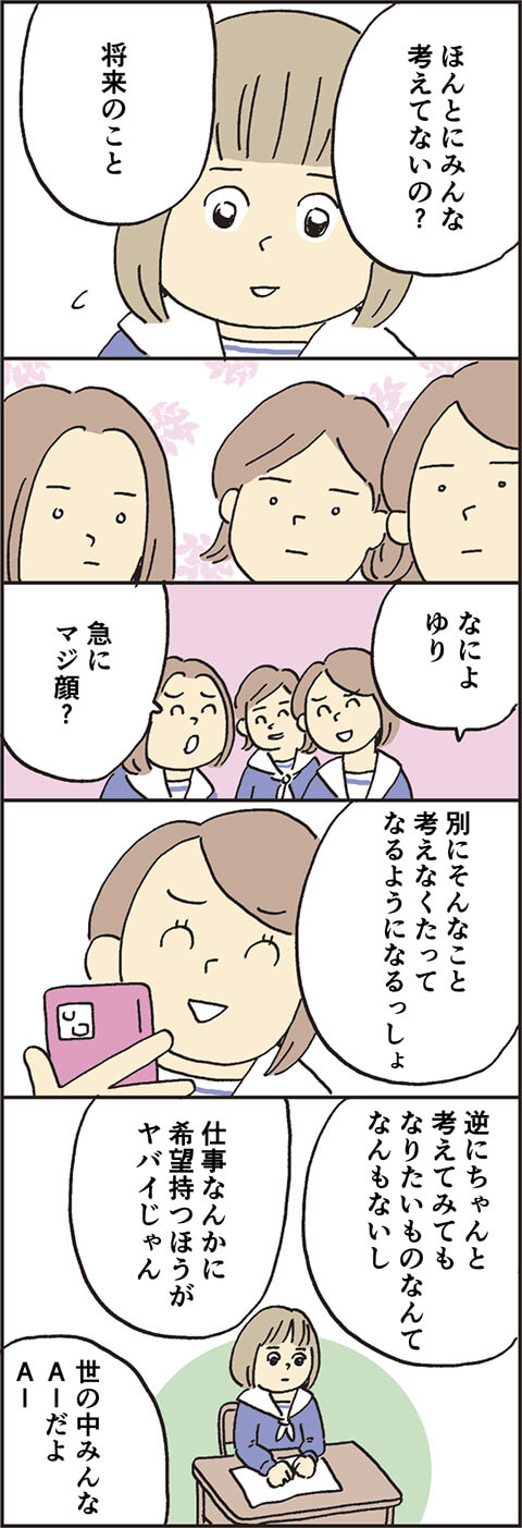 「テキトー」「なるようになる」と口をそろえる友達を横目に、やりたいことが見つからないことに思い悩むゆり。買い物袋を両手に抱えて汗だくで仕事から帰ってきた圭子は、女子のキャリアの先輩として、ゆりの悩みにどんな言葉をかけるのでしょうか?